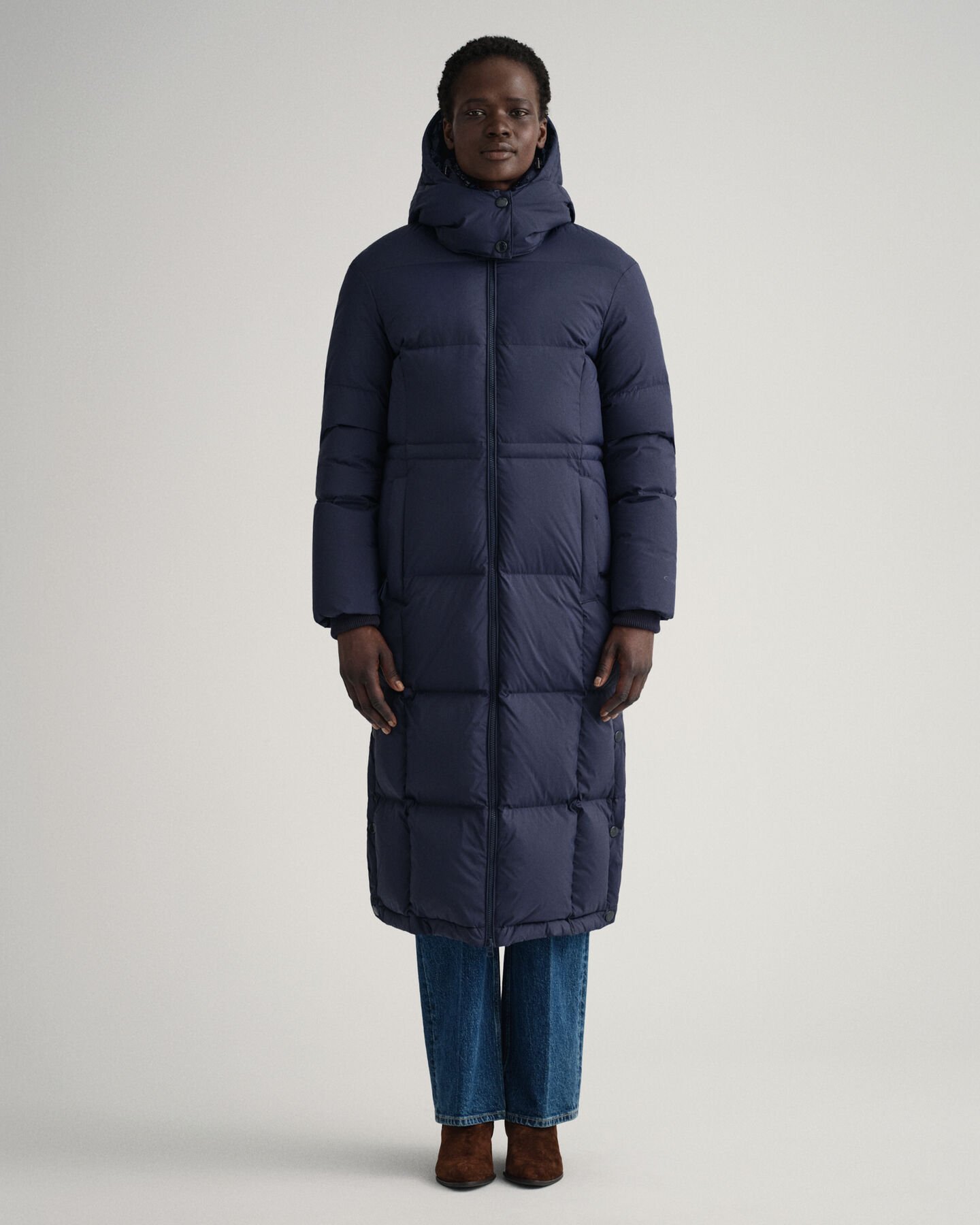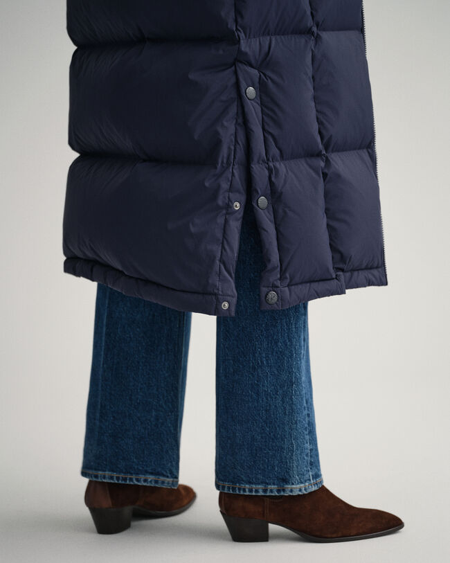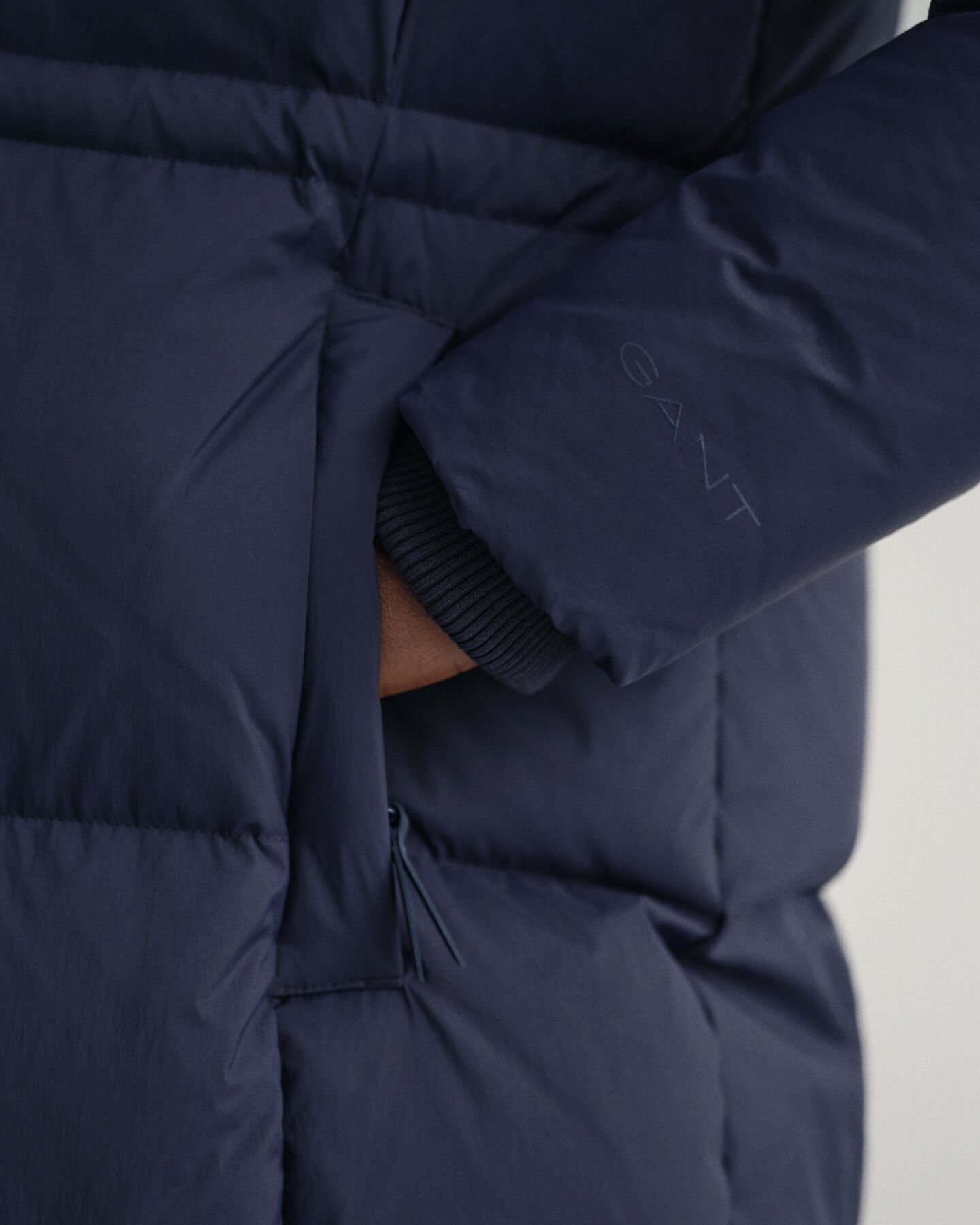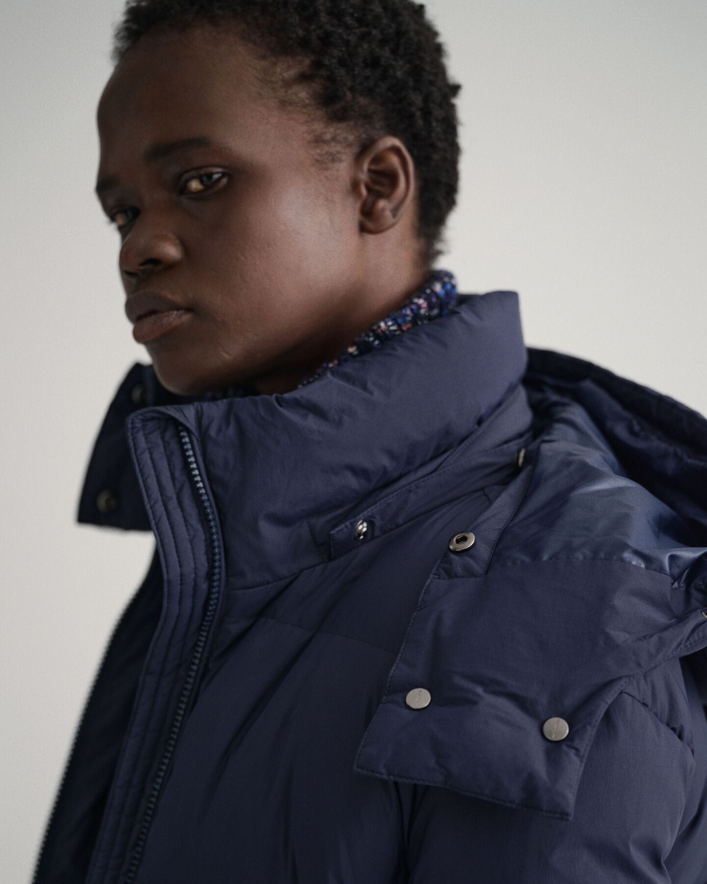 Fabriquée en nylon recyclé avec doublure en polyester recyclé, cette doudoune déperlante est rembourrée de 90 % de duvet certifié et de 10 % de plumes pour offrir un maximum de chaleur en hiver. Ce modèle long présente une coupe regular facile à superposer, une capuche amovible, un cordon de serrage à la taille, des poignets côtelés, deux poches extérieures zippées et un logo imprimé au niveau du poignet pour créer un look sportif. La longueur mi-mollet s’accompagne de fermetures à boutons-pression sur l'ourlet latéral pour ajuster la coupe.