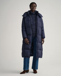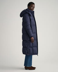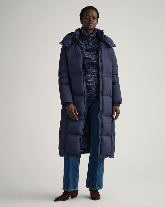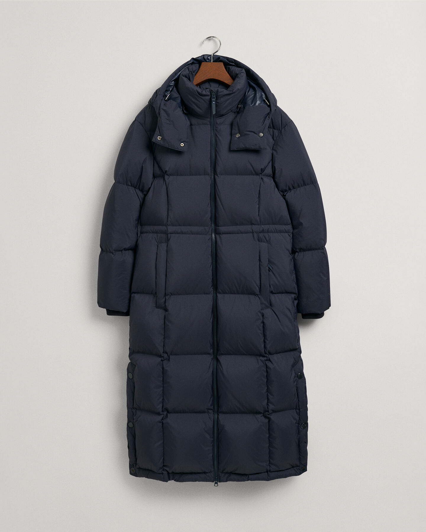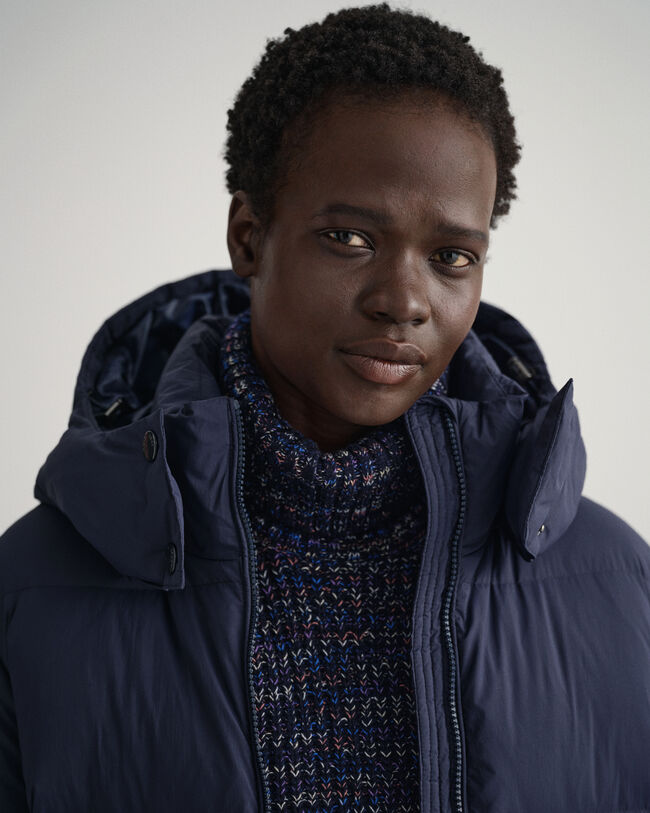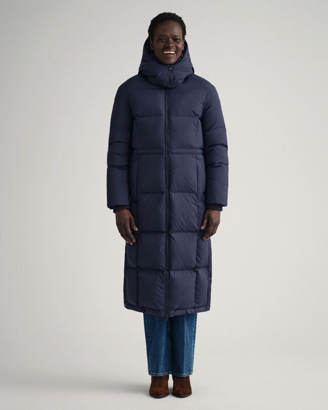 Fabriquée en nylon recyclé avec doublure en polyester recyclé, cette doudoune déperlante est rembourrée de 90 % de duvet certifié et de 10 % de plumes pour offrir un maximum de chaleur en hiver. Ce modèle long présente une coupe regular facile à superposer, une capuche amovible, un cordon de serrage à la taille, des poignets côtelés, deux poches extérieures zippées et un logo imprimé au niveau du poignet pour créer un look sportif. La longueur mi-mollet s’accompagne de fermetures à boutons-pression sur l'ourlet latéral pour ajuster la coupe.