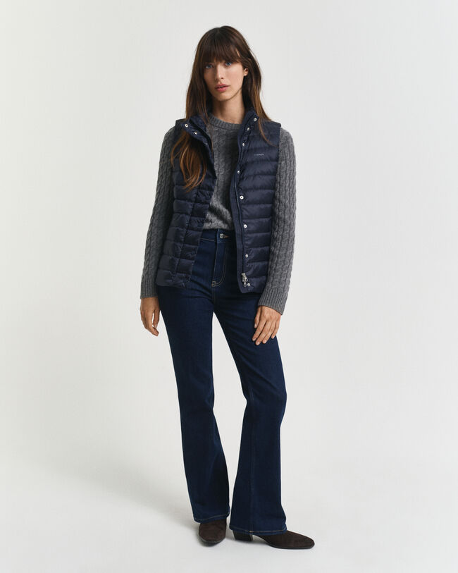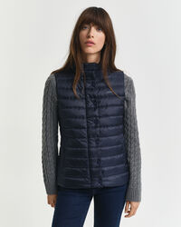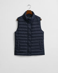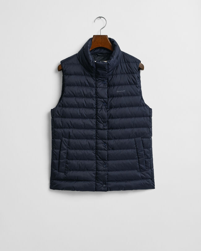 Cette doudoune sans manches est légère et facile à porter en superposition, à tout moment de l'année. Elle est réalisée en polyester recyclé certifié d'une légèreté extrême avec un fini hydrofuge, et présente un garnissage composé de 90 % de duvet et 10 % de plumes. Doté d'une coupe regular s’arrêtant juste au-dessus des hanches, ce modèle se porte aussi bien seul sur une chemise que sous un manteau plus épais lorsqu'il fait particulièrement froid. L'ensemble est complété par un col droit, des boutons-pression laqués, des poches inclinées avec passepoil, une fermeture zippée à double sens et un logo Gant imprimé au niveau de la poitrine. La doudoune sans manches est dotée d'un fini hydrofuge durable (DWR) qui aidera à évacuer l'eau en cas de pluie légère.