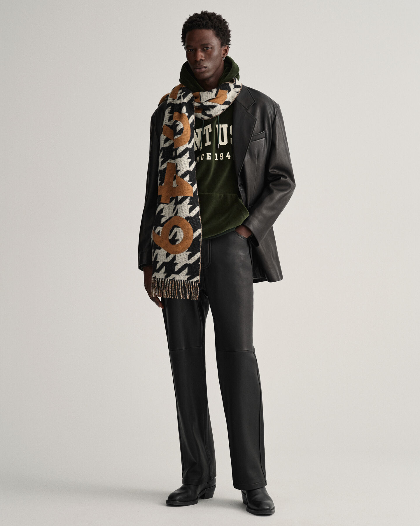 Complétez vos tenues d'hiver avec cette écharpe en laine preppy, ornée d'un motif pied-de-poule double face et d'une inscription 1949.