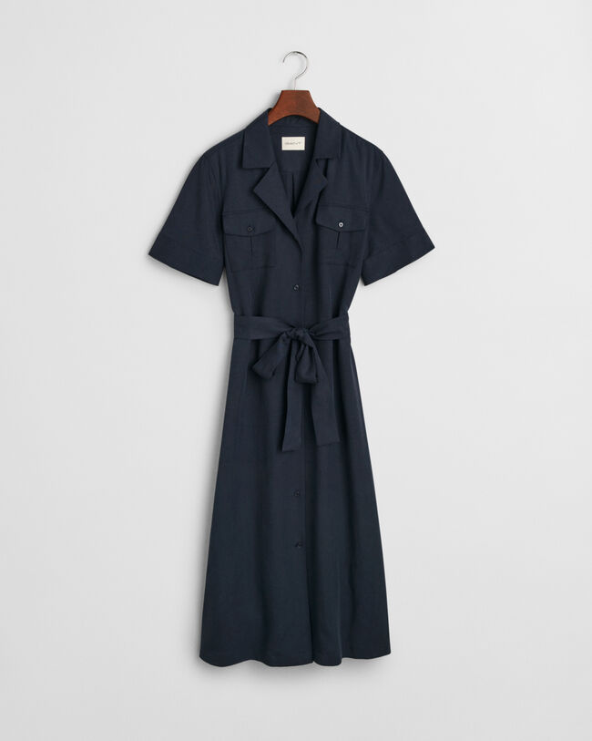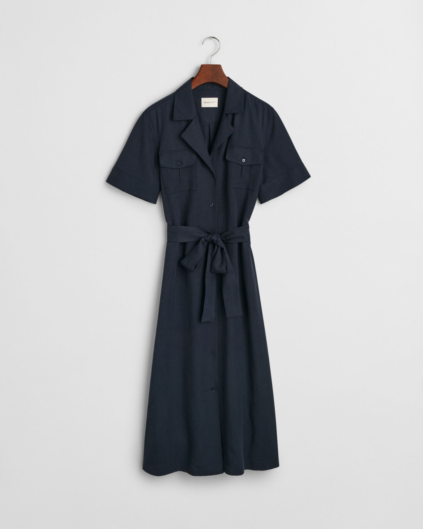 Cette robe-chemise à manches courtes au style naturellement chic est confectionnée en utilisant un mélange de lin et de lyocell doux, qui offre un joli drapé. Elle est dotée de deux poches au niveau de la poitrine, qui lui confèrent un esprit moderne et fonctionnel, d’un col ouvert et d’une patte de boutonnage repliée. Elle présente une coupe regular, une longueur mi-mollet, une ceinture à la taille et des fentes sur les côtés.
