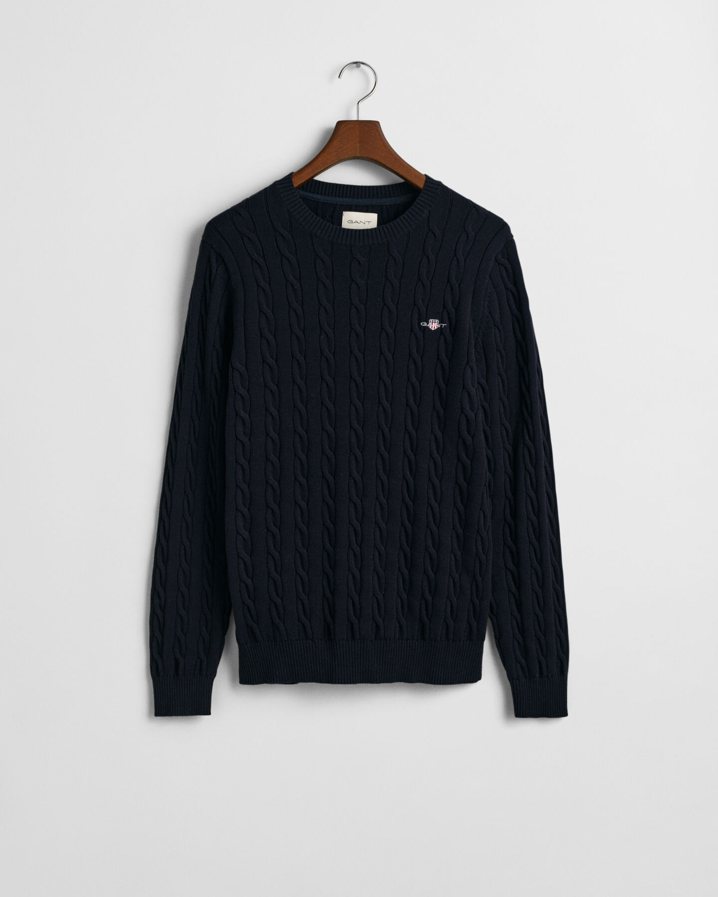 Arborant une maille torsadée sur l'ensemble, ce pull en coton doux présente une coupe regular et un col rond classique. Cet incontournable du style preppy est agrémenté de notre célèbre écusson Gant Archive brodé sur la poitrine, ainsi que de bords-côtes au niveau du col, de l'ourlet et des poignets.