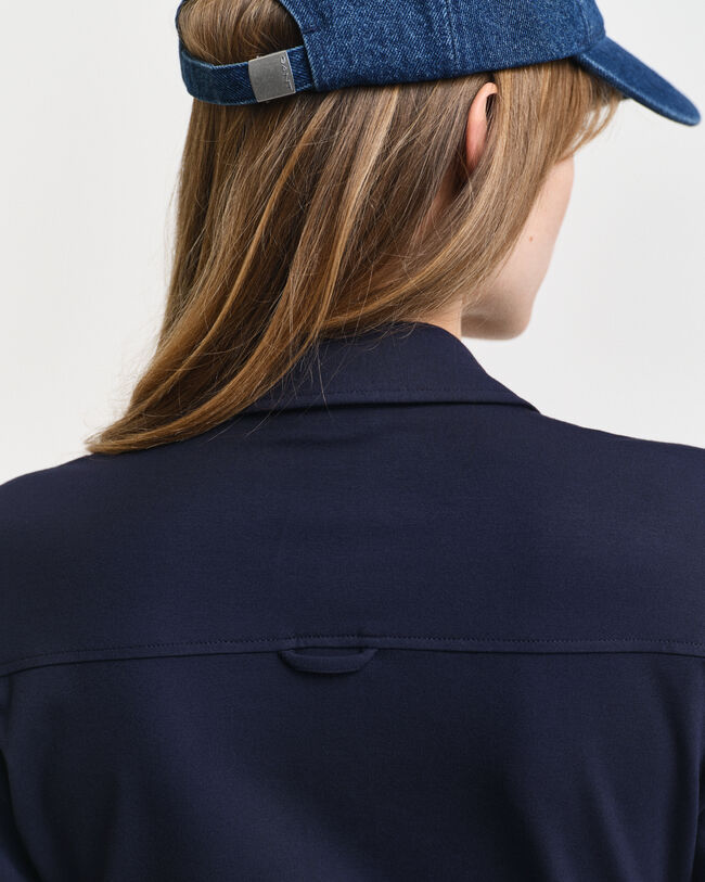 Confectionnée en viscose mélangée douce et extensible, cette robe-chemise présente une coupe slim qui s’arrête juste sous le genou. Elle reprend certaines finitions caractéristiques des chemises telles qu’un col droit, une patte entièrement boutonnée et des poignets boutonnés. Cette robe est agrémenté d’une ceinture en tissu à la taille qui vient souligner la silhouette, ainsi qu'un logo GANT brodé au niveau du poignet.