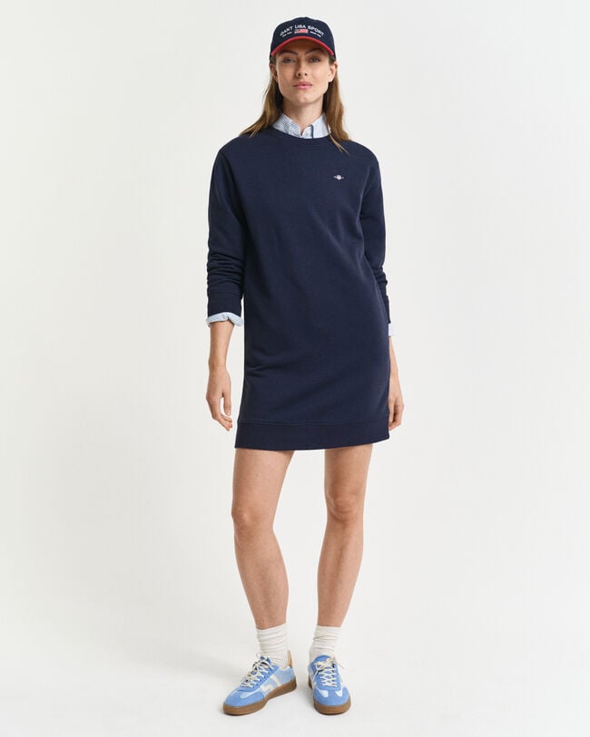 Cette robe sweat est confectionnée en coton mélangé, avec une structure en diagonale et un envers en éponge brossée pour plus de douceur. Dotée d'une coupe décontractée qui s'arrête au-dessus du genou, elle possède des manches longues et un col rond classique. Ce modèle présente également des bords-côtes au niveau de l'ourlet, de l'encolure et des poignets, le tout complété par un écusson GANT brodé au niveau de la poitrine. Ce modèle est conçu pour créer une silhouette décontractée. Si vous souhaitez créer un rendu plus ajusté, nous vous recommandons de choisir la taille en dessous de votre taille habituelle.