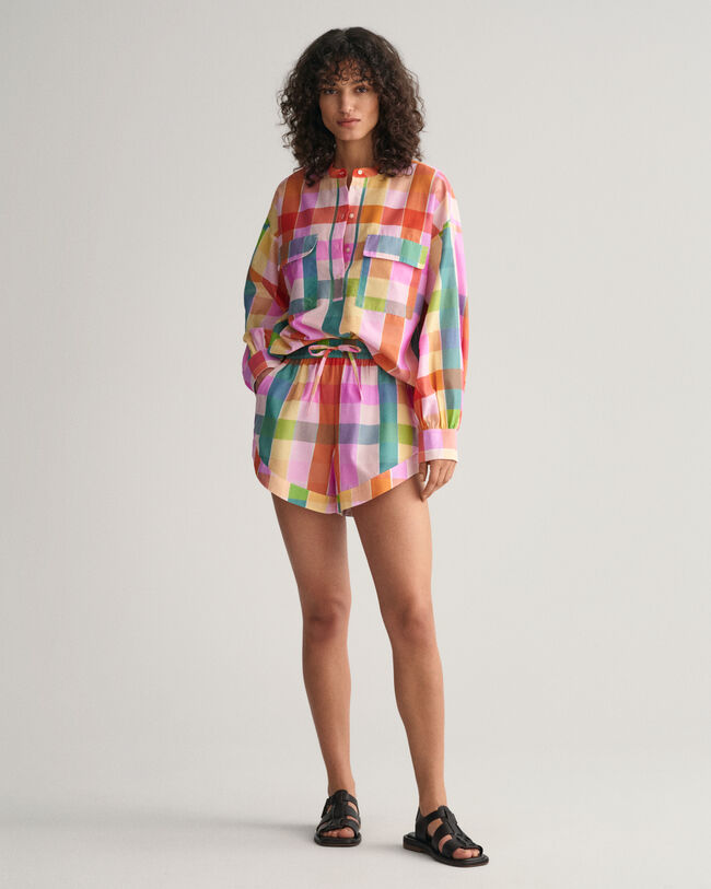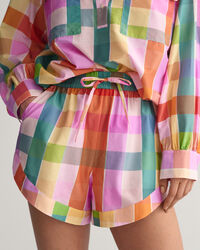 Parfait pour arborer un style élégant en été, ce short en mélange fin de coton et soie doit son éclat à ses carreaux multicolores teints en fil. Il présente une coupe décontractée, une taille haute ainsi que des jambes larges et courtes, le tout complété par un confortable tour de taille élastique et des poches sur les coutures latérales. Portez ce short avec un débardeur basique ou une chemise blanche toute simple.