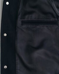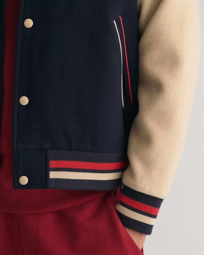 Cette veste universitaire emblématique présente une coupe regular et descend jusqu'à la taille pour créer une silhouette classique. Dotée d'une fermeture à boutons-pression peints sur le devant, cette pièce est conçue avec des manches raglan, des poches passepoilées sur les côtés et deux poches passepoilées à l'intérieur. La veste est également agrémentée de bords côtes rayés à l'ourlet et aux poignets, ainsi que d'un écusson en éponge G sur la poitrine.