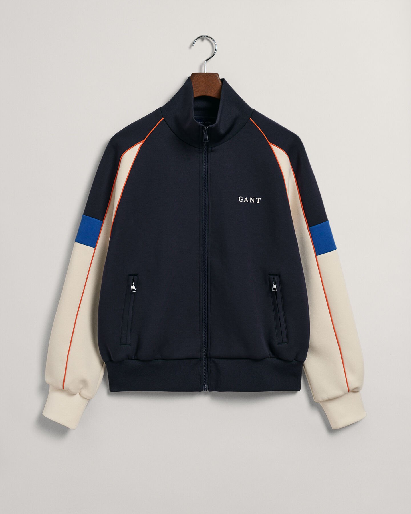 Confectionnée dans un tissu néoprène à la fois sportif et doux, cette veste de survêtement présente un motif en colour-block. Il arbore également une coupe regular, des fronces supplémentaires sur le corps et des manches raglan pour une coupe plus confortable. L'ensemble est complété par des passepoils sur la manche, des finitions côtelées, des poches zippées et notre célèbre logo GANT brodé sur la poitrine. À associer au pantalon de jogging assorti pour composer une tenue coordonnée.